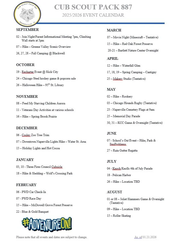 Dens will be responsible for assisting with the pack’s monthly event as needed. Duties may include finding out the cost, finalizing the date, communicating with the pack, handling the replies, gathering supplies, and collecting the fees. If needed to coordinate, the den will be provided with a contact and Google signup link. All emails should be approved by Cubmaster, Committee Chair, and/or Treasurer before sending out to the pack.